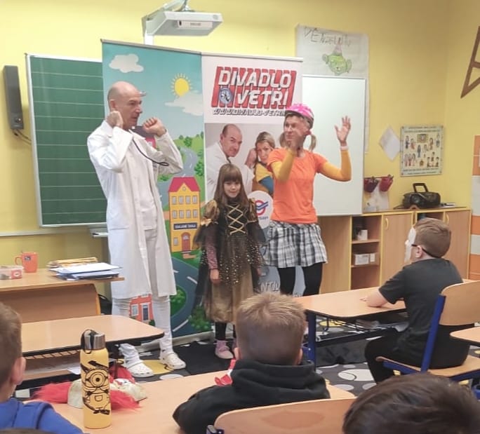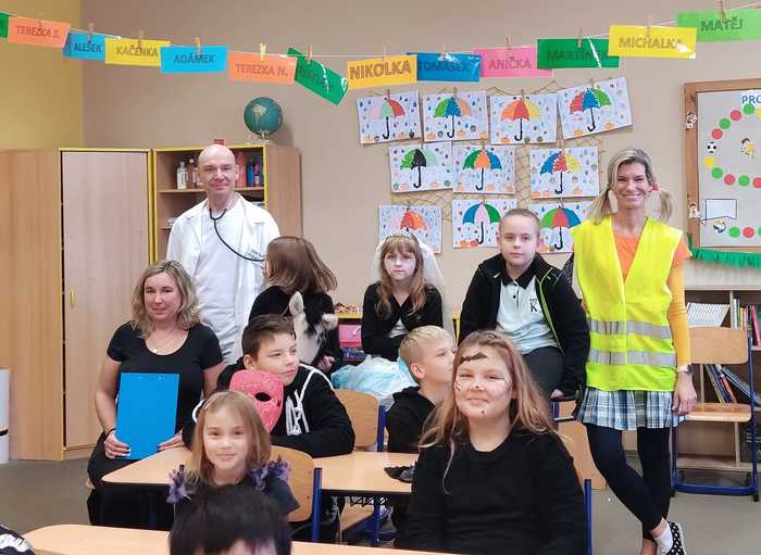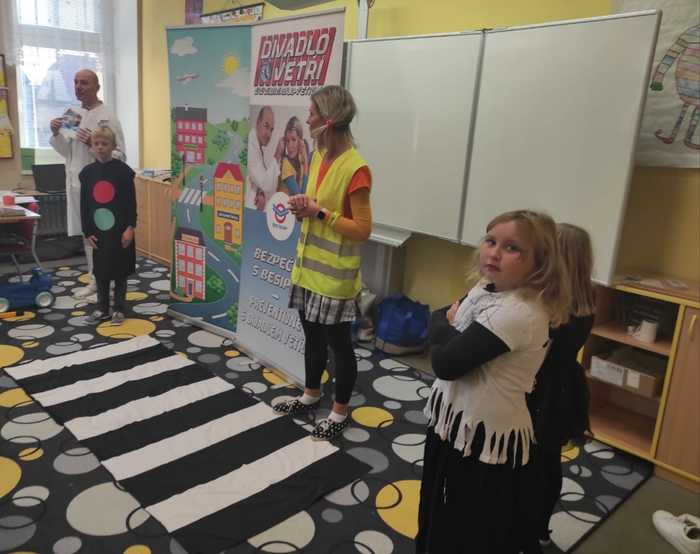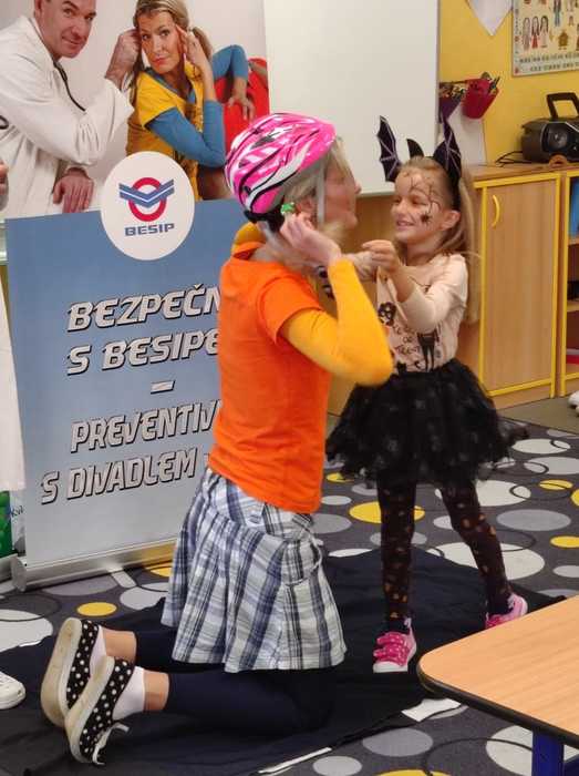V úterý 25. října se děti z přípravné až třetí třídy dozvěděly mnoho důležitých informaci o bezpečnosti silničního provozu. Nenásilnou a vtipnou formou jim byla vysvětlena nutnost nosit helmu, správné přecházení silnice, děti si také vyzkoušely chrániče na zápěstí, na lokty a na kolena. Velmi děkujeme paní Míše Doležalové a panu Vlastu Vébrovi z Divadla VeTři.