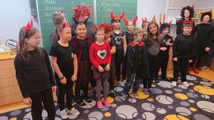 Třeťáci si v pondělí 6. 12. užili čertí den. Návštěva čertů s Mikulášem a anděly pro ně byla zpestřením veselého dne, zazpívali a zatančili čertí písničku a za odměnu byla nějaká dobrota, ale objevily se také brambory i uhlí.