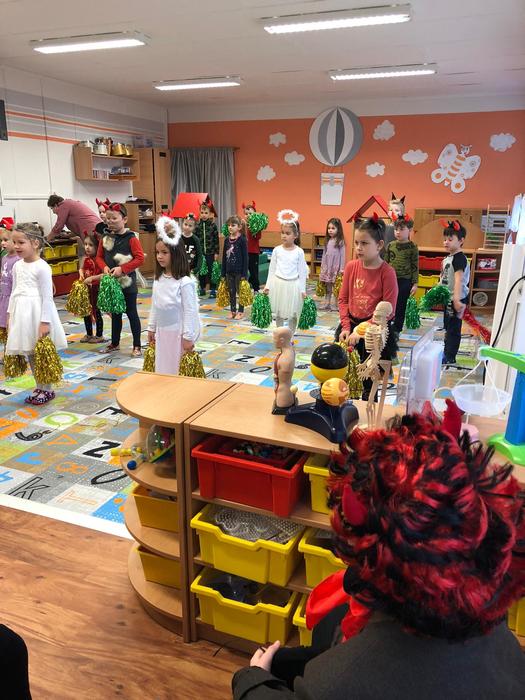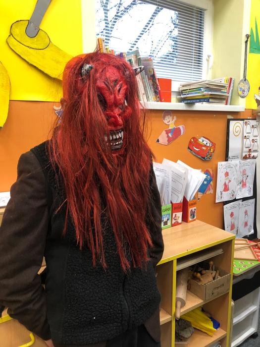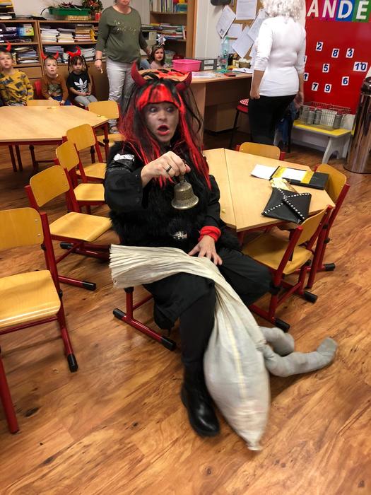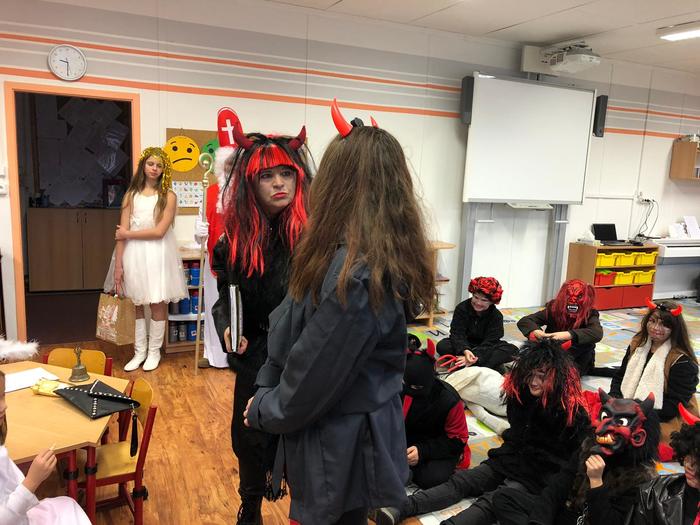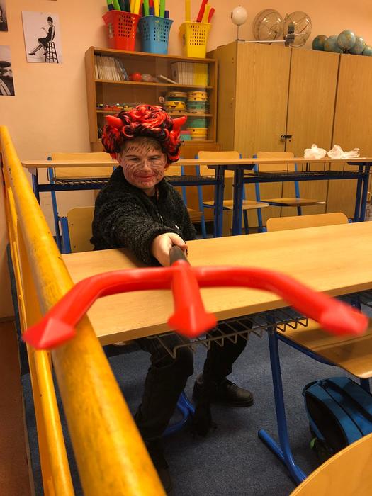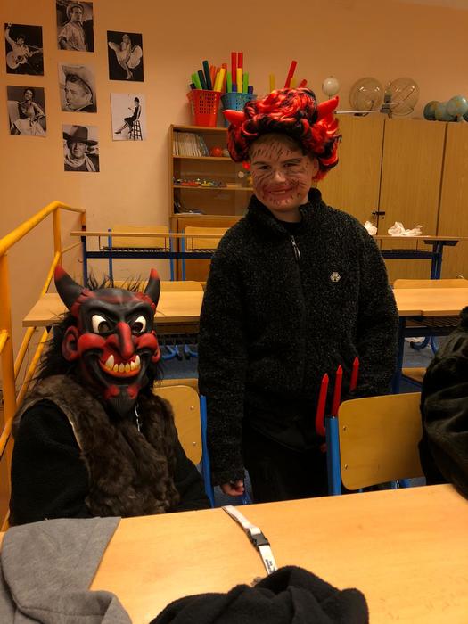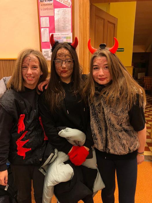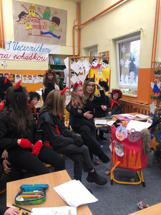 V pondělí 5. prosince se žáci šesté třídy proměnili v čerty, anděle a Mikuláše. Společně s paní učitelkou a asistentkou se vypravili do mateřské školky a na první stupeň, aby ostatním dětem ukázali, jak se učí v pravé čertí škole.
