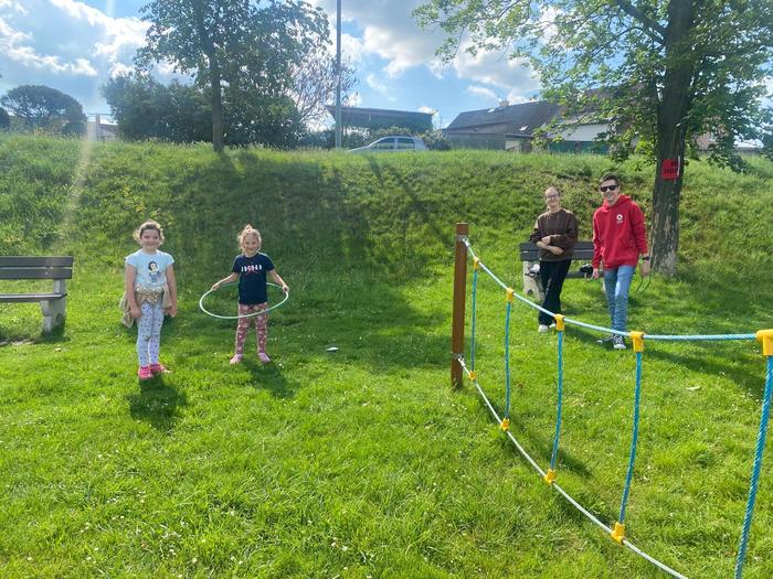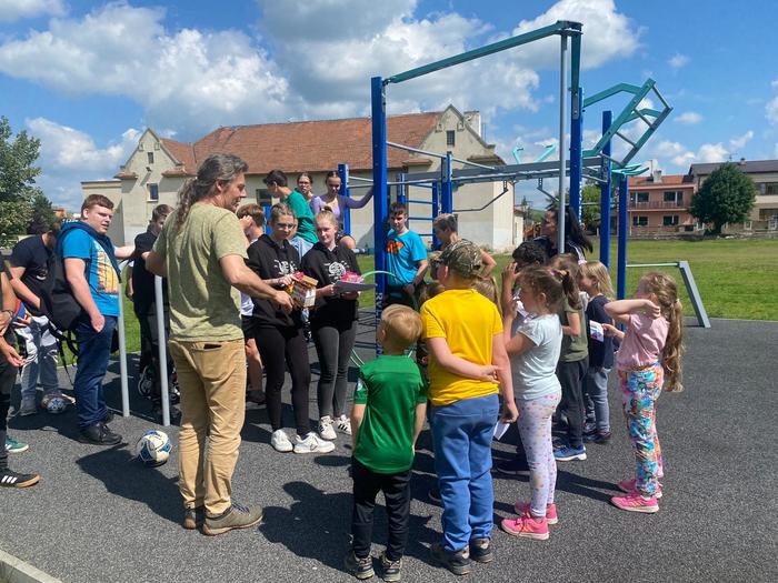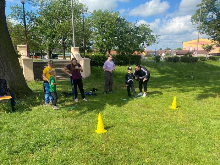 Naši deváťáci připravili v rámci projektového dne zábavnou soutěžní stezku pro děti z první třídy. Prvňáčci si mohli zasoutěžit v běhu přes překážky, zaskákat přes švihadla, zakopat na branku, zahrát zvířecí pexeso a vyzkoušet několik dalších disciplín. Na závěr dostali děti památeční diplomy za úspěšné splnění všech úkolů a sladkou odměnu.