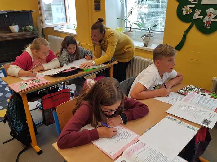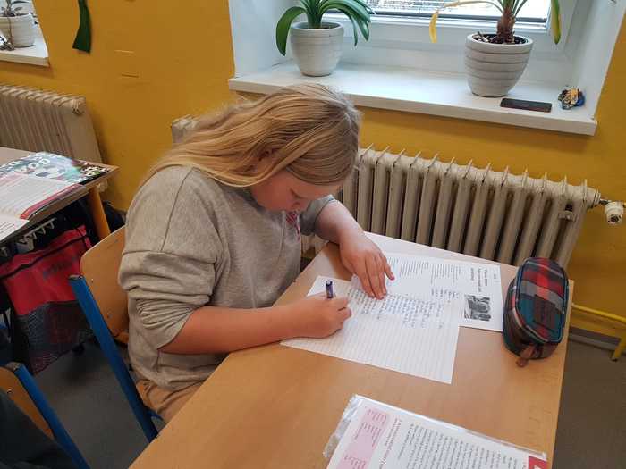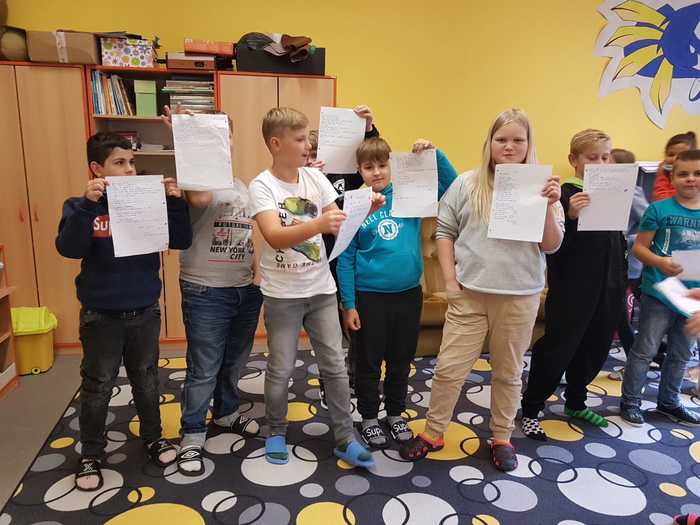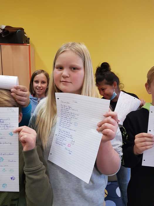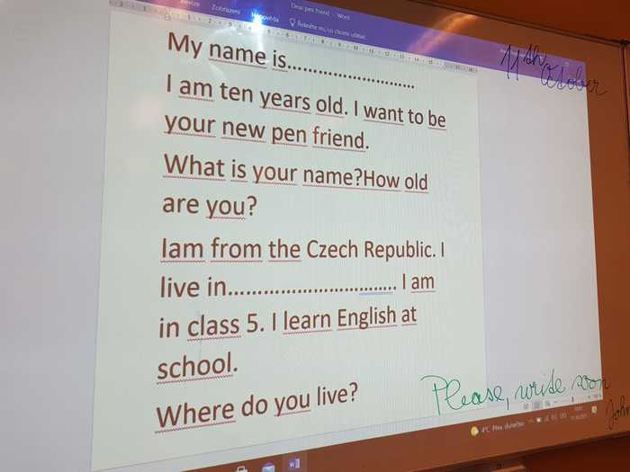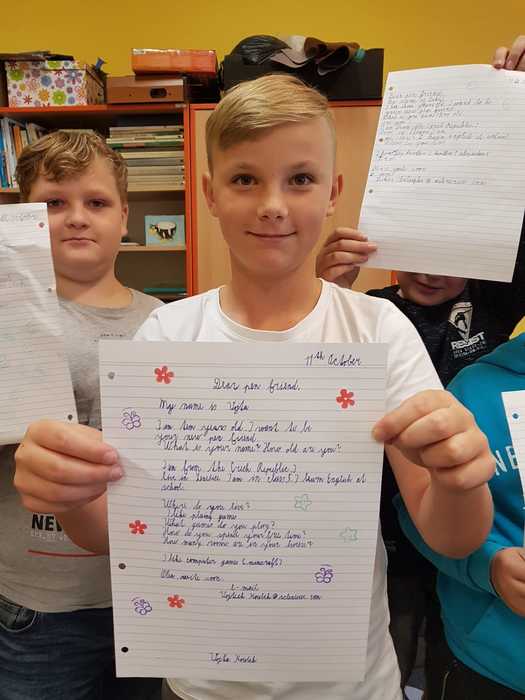 Žáci páté třídy se v první lekci anglického jazyka seznámili s tématem My Letter. Učili se novou slovní zásobu, tvořili věty, které se dají v dopise použít a také si osvojili, jak má správný dopis vypadat a co má obsahovat. Naučené věty i slovíčka potom použili v reálném dopise, který každý sám za sebe napsal svému neznámému kamarádovi do základní školy na NOVÝ ZÉLAND, na severní ostrov do města Auckland.
