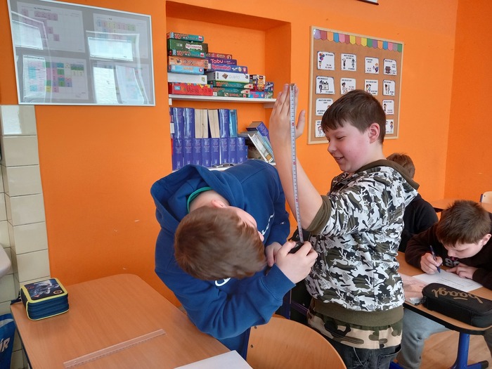 V 6. třídě jsme začali téma "Fyzikální veličiny". Jako první fyzikální veličinu jsme měli "Délka". Po teoretické části a vysvětlení jak se správně měří, měli žáci opět možnost měření vyzkoušet. Dostali k dispozici různé druhy měřidel a měli vždy zvolit to správné dle zadání. V prvním zadání si měřili své části těla, která se dříve používala jako různé jednotky délky např. palec, stopa, loket, krok. V druhé úloze měli změřit třídu a spočítat její plochu a poslední úloha byla na aritmetický průměr délky lavice.