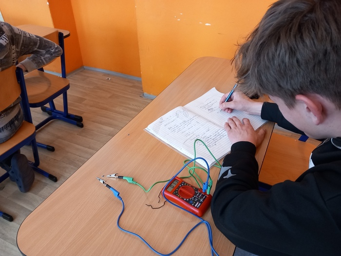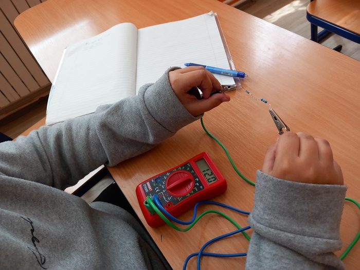 V 8. třídě pokračujeme kapitolou "Elektrické jevy" dostali jsme se k součástce rezistor a tak jsme opět mohli využít měření a multimetr. Žáci dostali dva druhy rezistoru a na každém změřili jeho odpor. Dále jsme si vysvětlili co znamená sériové zapojení a měli oba rezistory sériově zapojit a změřit jejich výsledný odpor. Potvrdili si tak vzoreček pro výpočet sériového zapojení. Výsledný odpor při sériovém zapojení byl součet obou předešlých měření samostatných rezistorů.