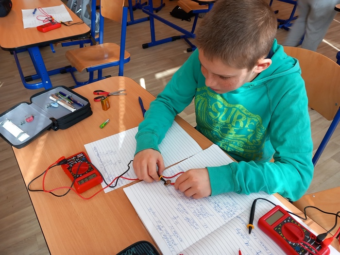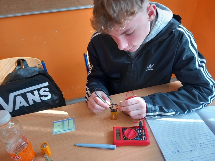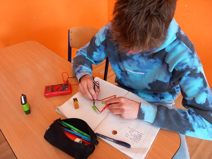 V 8. třídě probíráme téma "Elektrické jevy". Dostali jsme se k elektrickému napětí a tak nastal čas, aby i "osmáci" zkusili měřit sami a vše si tak mohli vyzkoušet. Před měřením byli všichni poučeni jak s přístrojem zacházet a co mají dělat. Pak se pustili do práce. Dostali různé druhy baterií a měli si nejprve zjistit co je to za typ baterie, jaké napětí výrobce na baterii udává a poté měli pomocí multimetru zjistit zda hodnota odpovídá.