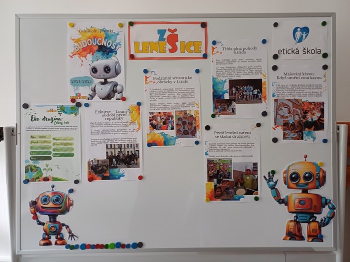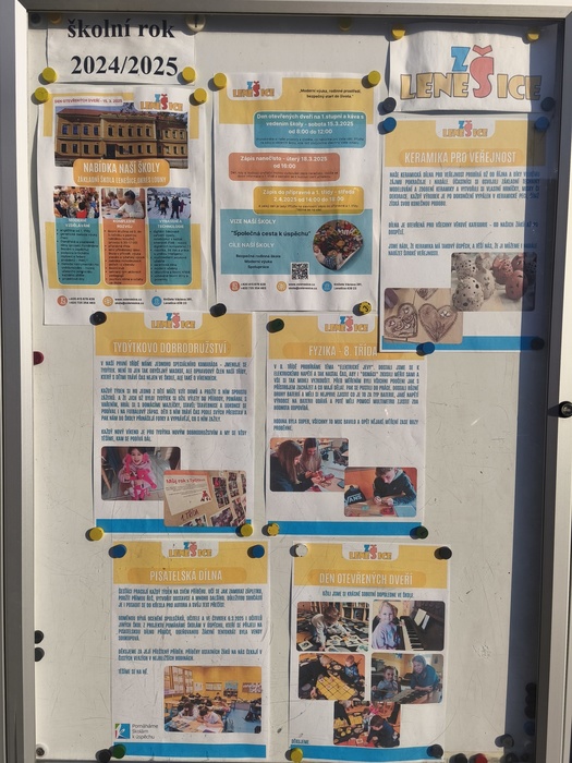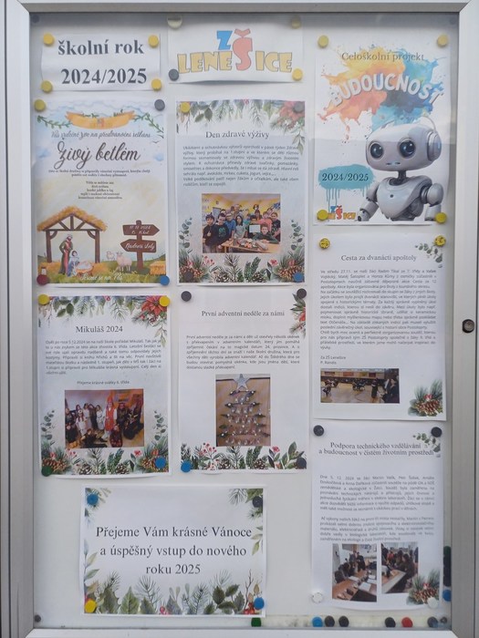 Pravidelně aktualizujeme vitrínu u Coopu a nástěnku na obecním úřadě, abyste měli přehled o dění v naší škole. Najdete tam informace o školních akcích, výletech, projektech, úspěších našich žáků, ale i novinky z výuky.