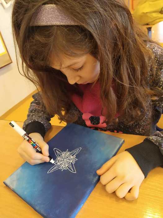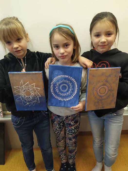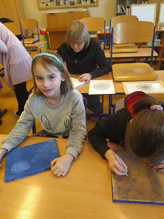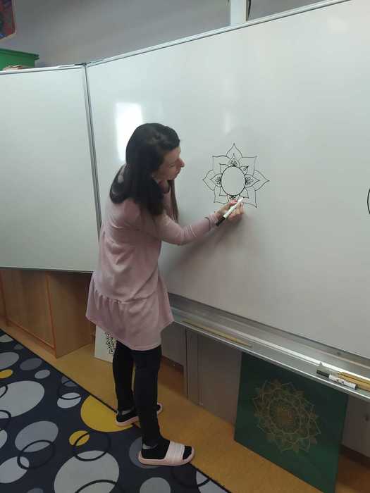 Dnes se uskutečnila 2. část přednášky na téma Mandala a její kresba. Děti byly natěšené a bylo to poznat na jejich práci. Po malé ukázce, jak začít malovat, se pustily s nadšením do kresby. Pečlivě rozmýšlely každý tah tužkou, aby konečné obtahování fixem bylo dokonalé. Dnes se k nám připojila i paní učitelka Šefčíková a musím říct, že je skrytý talent. Z krásných a originálních obrázků bude utvořena výstava.