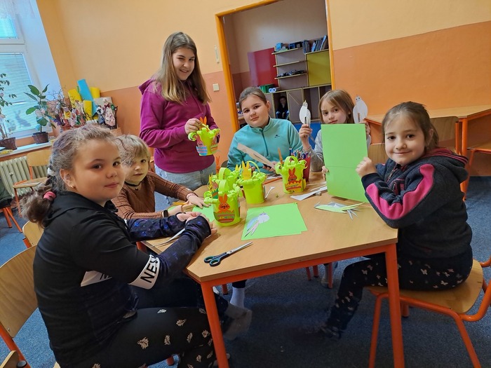 Jako každý měsíc nás čekalo různé tvoření. Několik týdnů jsme dávali dohromady velikonoční výzdobu, kterou už můžete vidět před školou a na oknech. Také jsme malovali barvami na sklo, sázeli osení, malovali kraslice, dělali jarní pomazánky a zdobili nástěnky jarními obrázky.