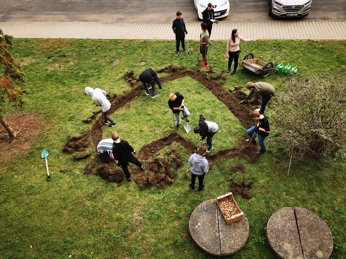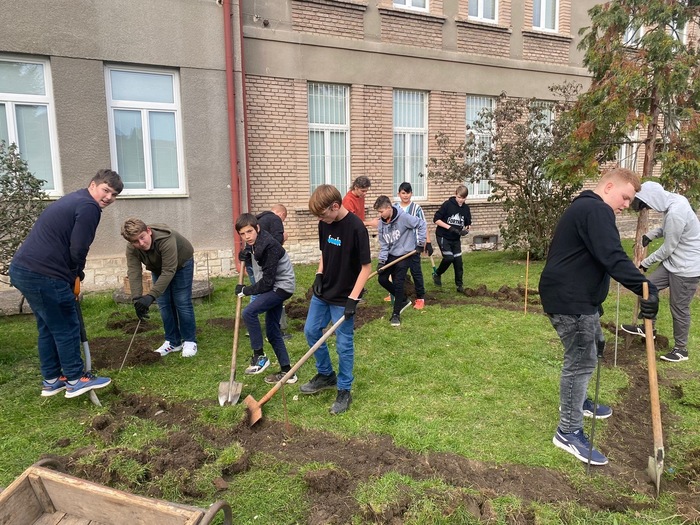 V rámci pěstitelských prací jsme se třídami II. stupně realizovali projekt Narcisové srdce. Jedná se o velký záhon ve tvaru srdce, který jsme vytvořili před budovou II. stupně. Sedmáci záhon ve svých hodinách navrhli a vyměřili. Osmáci vykopali drny a zasadili cibulky. Se šesťáky jsme nakonec všechno dočistili, pohrabali a odvezli drny na kompost. Pokud vše půjde podle plánu, na jaře narcisové srdce vykvete a okrášlí prostor před II. stupněm.