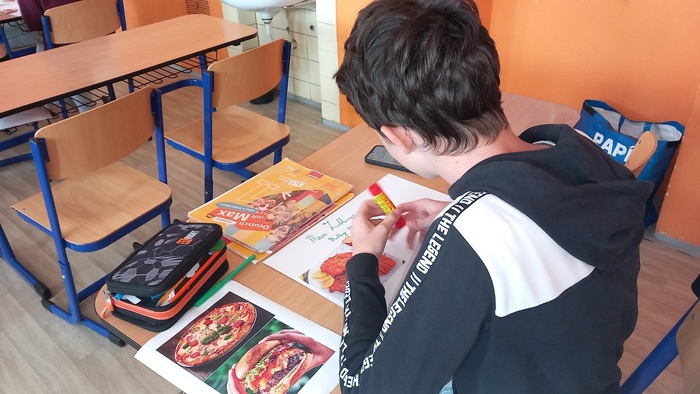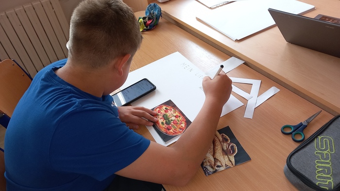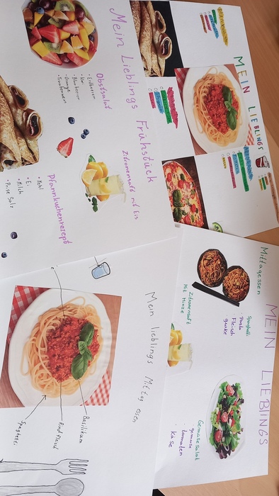 Konec školního roku se nám blíží a to je vždy čas na závěrečnou práci v německém jazyce. Letos jsme se naučili pozvat kamaráda na párty, koupit si jídlo v kiosku, popovídat si o denním režimu, říct si jaké jsou naše koníčky a poslední kapitola byla o jídle. Na toto téma byla i závěrečná práce a to vytvořit koláž s naším oblíbeným jídlem a vypsat ingredience.