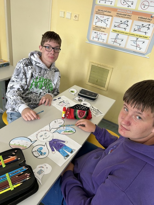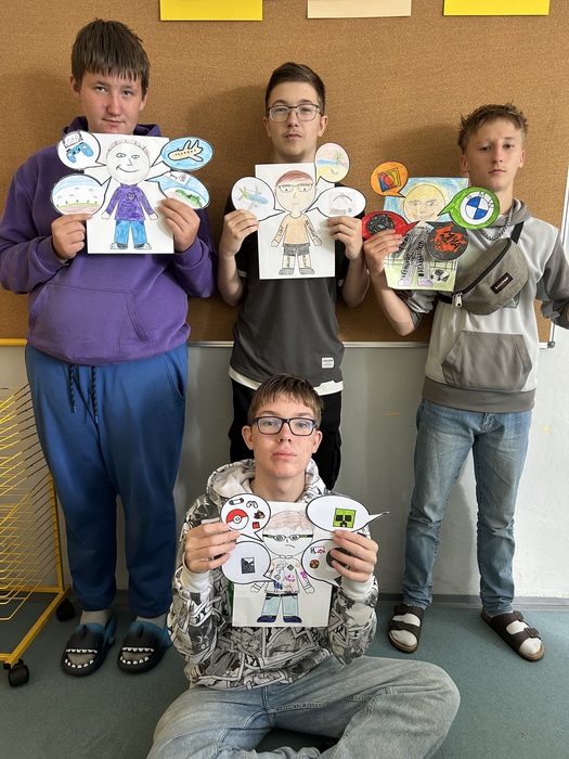 Každý si svoji postavu vybarvil podle sebe. Do bublin kolem postavy jsme kreslili obrázky svých koníčků a zájmů a dovnitř postavy jsme psali svoje vlastnosti. Některé postavy jsou fakt originální a jde podle nich poznat, kdo je kdo. Myslím, že se nám to celkem povedlo a byla to docela zábava.