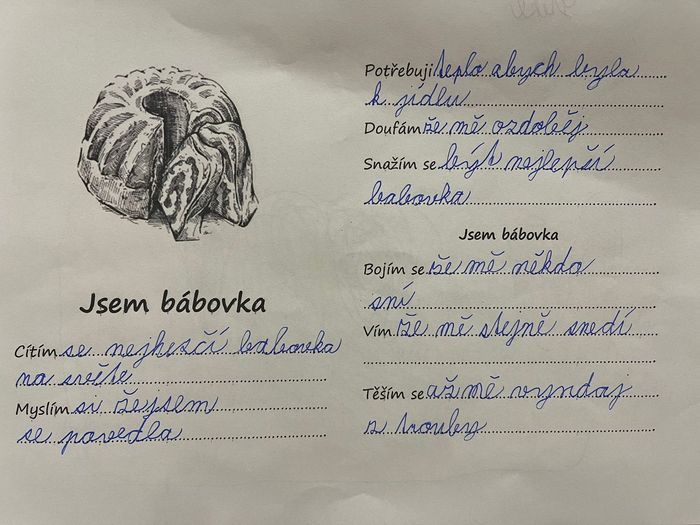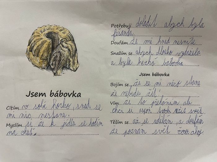 „Chtěli byste být bábovkou? No jen si to představte …“ V době, kdy se bábovky pekly, si žáci mohli představit, jaké by to bylo, kdyby byli bábovkou. Vymysleli krásné „životabásně“ a všichni jsme se nad básněmi pobavili a zároveň nám čas pečení rychle uplynul.