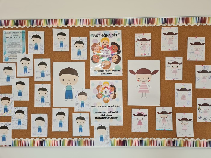 Naše škola letos opět odstartovala celoročním projektem, tentokrát s názvem „Svět očima dětí“, který propojuje tvořivost, sebereflexi i vzájemné poznávání. A hned v prvních dnech školního roku jsme se pustili do první aktivity – tvorby postavičky JÁ. Třeťáci se do úkolu pustili už 2. září a zvládli ho ukázkově. Aktivitu si zopakovali už podruhé, takže mohli porovnat, jak se jejich postavička změnila od loňska – co zůstalo stejné a co se za rok proměnilo. Při práci si navíc zopakovali slovní druhy, protože každá část popisu měla své jazykové místo. Děti doplňovaly jméno, vzhledovou vlastnost, superschopnost nebo dovednost a to, co jim dělá radost. Na závěr vznikl tým postaviček, který bude třeťáky provázet celým školním rokem. Šesťáci nechali své postavičky JÁ ožívat také 2. září. Výsledky jejich práce nyní zdobí celou nástěnku ve třídě. Aktivita měla pro ně ještě jeden důležitý rozměr – do třídy přibyli noví spolužáci, a právě díky postavičkám JÁ se mohli navzájem lépe poznat. Zjistili, co je baví, co mají rádi a jací jsou – a to je skvělý začátek společné cesty.