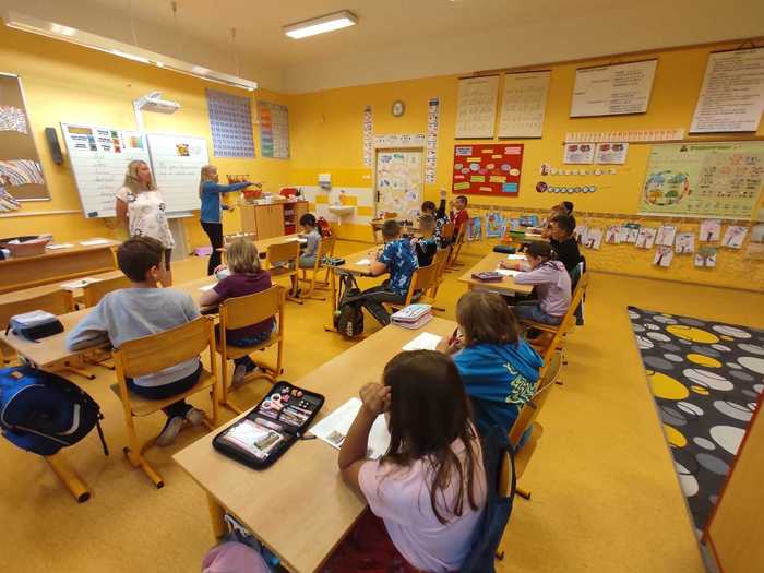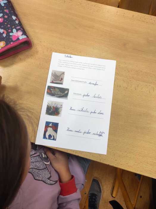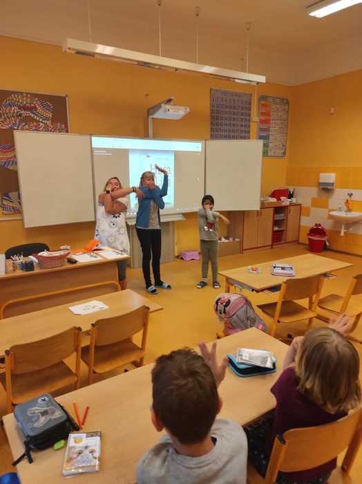 V úterý 6. června proběhla ve 2. třídě čtenářská lekce pod vedením p. uč. Pazourkové a p. uč. Pokutové. Nejdříve děti zjišťovaly, o čem knížka bude. To brzy a správně vyvodily z obrázků, na kterých byly indicie vedoucí k odpovědi HUSA. Při čtení knížky děti předvídaly, poznávaly cizokrajná zvířata, pobavily se při jejich předvádění a také psaly správné odpovědi do pracovního listu.