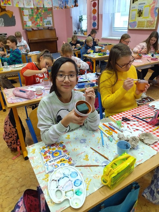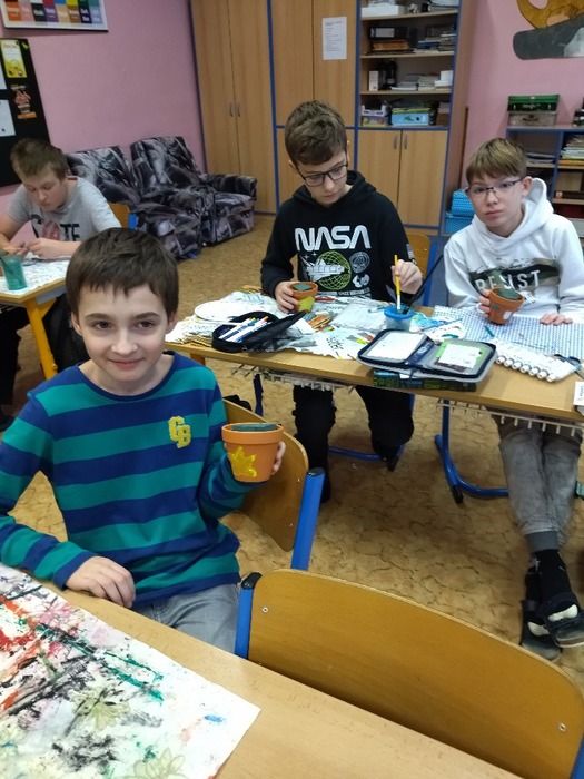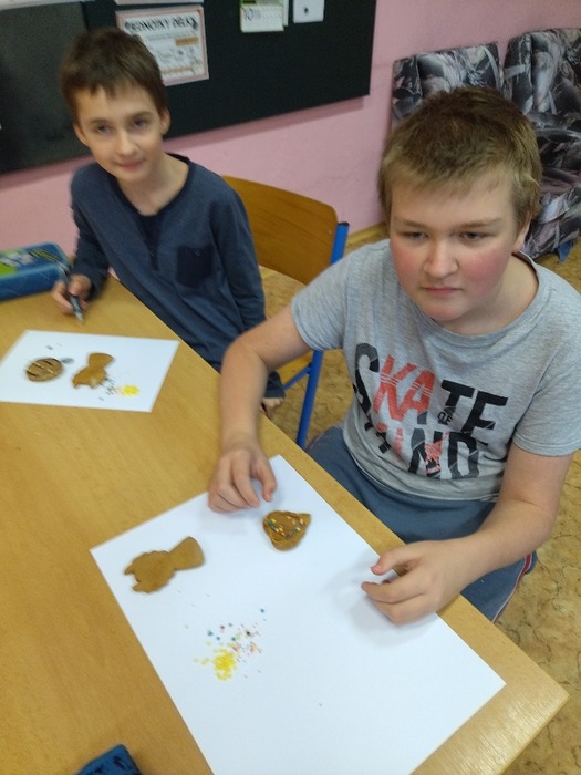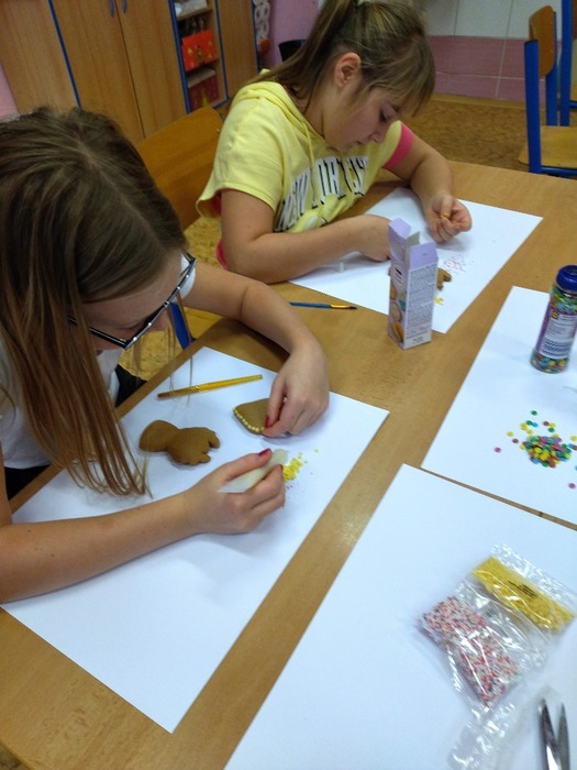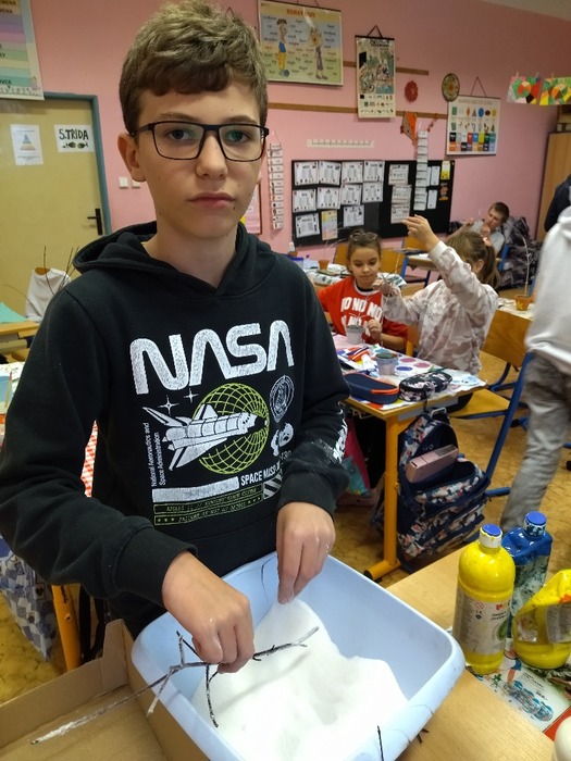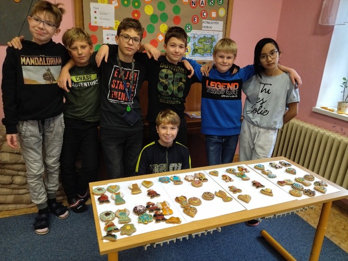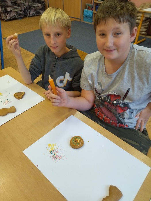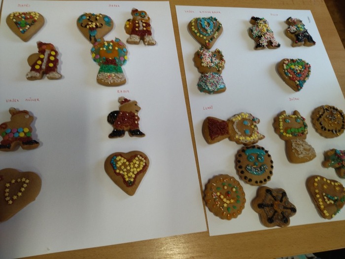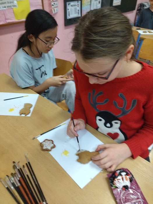Vánoční dílny jsou spojené s prodejem výrobků na vánočních trzích v sobotu 26.11. Každá třída si do svého stánku něco vyrobí nebo upeče. Páťáci tvořili dekoraci zasněžených větviček v květináči, kterou si vánočně vyzdobili. Také nazdobili perníčky s andělem, čertem nebo srdíčky. Vše je moc bavilo.