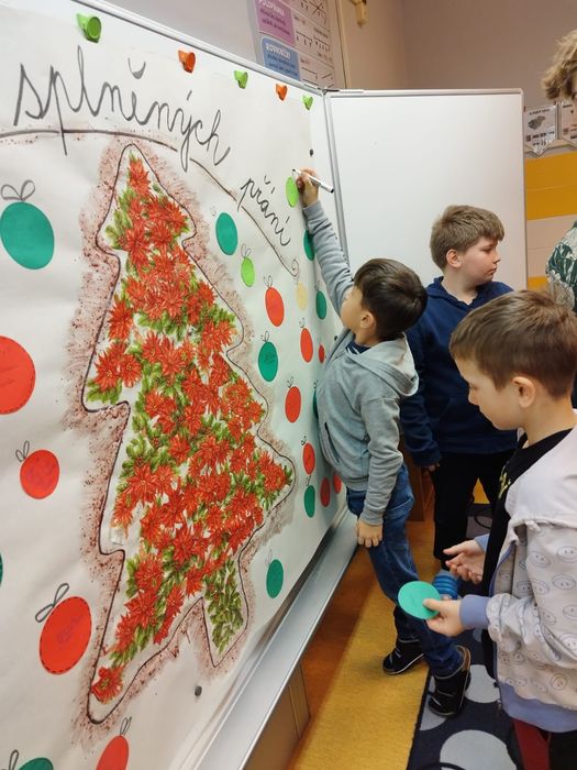 K vánočnímu stromu měli za úkol vymyslet přání, nesměla to být ale žádná věc. A co vymysleli?  Přijďte se podívat, jste srdečně zváni. Náš strom přání je vystaven ve vestibulu na 1. stupni.