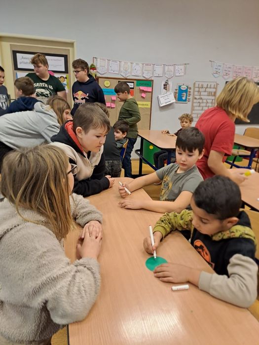 Páťáci připravili žákům z přípravky, 1., 2. 3. a 4. třídy vánoční čtení s překvapením. Přečetli žákům pohádku Děvčátko se sirkami, nad kterou poté společně diskutovali o životě.