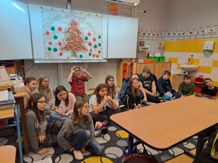 Páťáci připravili žákům z přípravky, 1., 2. 3. a 4. třídy vánoční čtení s překvapením. Přečetli žákům pohádku Děvčátko se sirkami, nad kterou poté společně diskutovali o životě.