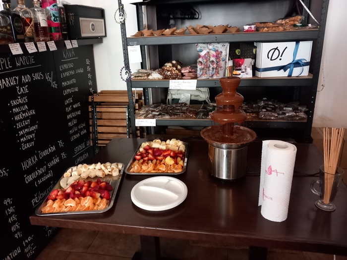 Dnes jsme měli další společný výlet a byli jsme se podívat v Lounech na náměstí, kde má paní Jana Klesalová otevřenou čokoládovnu s krásným názvem Pralalinka. Měli jsme domluvenou přednášku o čokoládě, jak se čokoládové pralinky vyrábí, jaké druhy čokolády jsou a samozřejmě nemohla chybět i ochutnávka. Dostali jsme čokoládovou fontánu s ovocem a žáci si mohli nabrat kolik chtěli. Někteří nakoupili dobroty i domů.