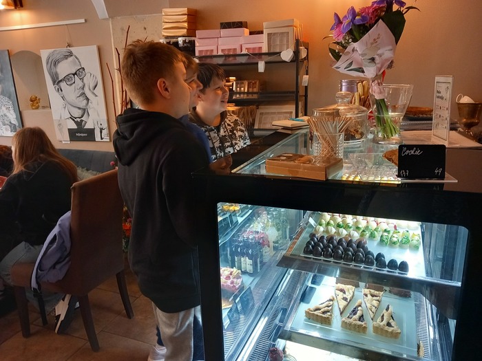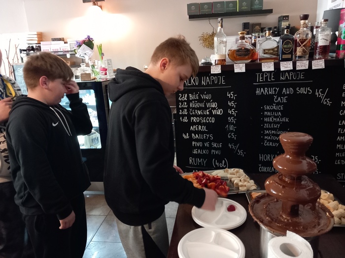 Dnes jsme měli další společný výlet a byli jsme se podívat v Lounech na náměstí, kde má paní Jana Klesalová otevřenou čokoládovnu s krásným názvem Pralalinka. Měli jsme domluvenou přednášku o čokoládě, jak se čokoládové pralinky vyrábí, jaké druhy čokolády jsou a samozřejmě nemohla chybět i ochutnávka. Dostali jsme čokoládovou fontánu s ovocem a žáci si mohli nabrat kolik chtěli. Někteří nakoupili dobroty i domů.