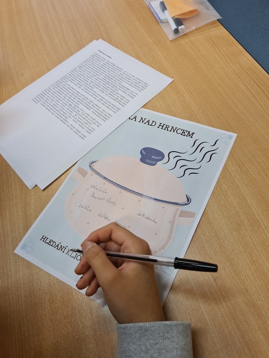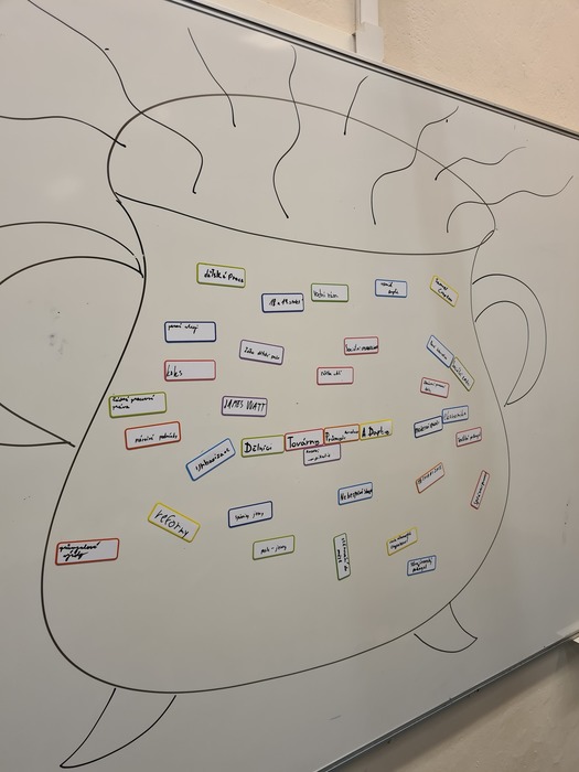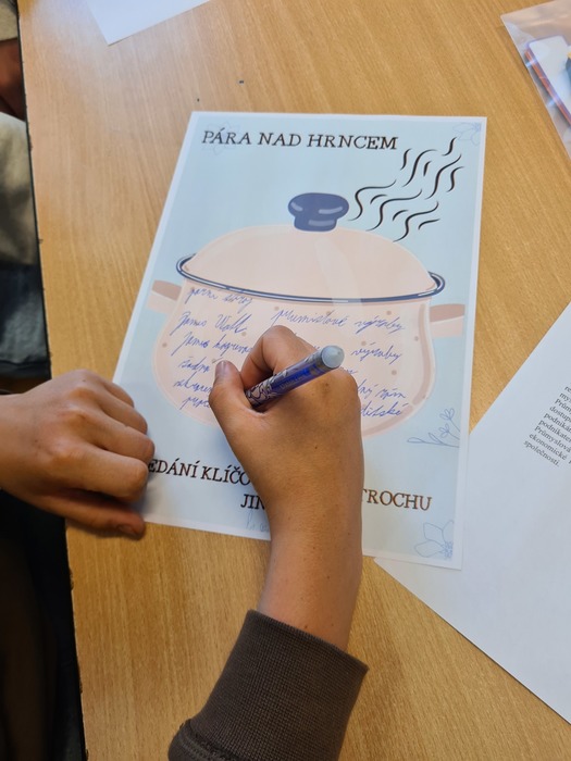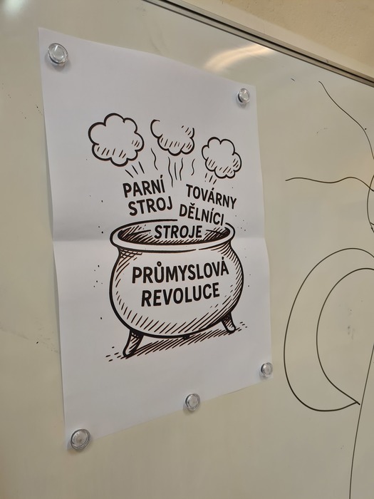 Představte si, že byste se mohli na chvíli vrátit do dob, kdy města zahaloval kouř z továren a ulice duněly rachotem parních strojů. Právě tam jsme se v češtině vydali – ne strojovým výkladem, ale trochu jinak. Vařili jsme! Klíčová slova z průmyslové revoluce se nám začala vařit přímo pod rukama. Každá dvojice žáků dostala „papírový hrnec“, odborný text a magnetické štítky s fixami. Úkolem bylo vybrat co nejvíce klíčových slov z odborného textu. (Ano, z toho, kde se mluví o páře, parních strojích, fabrikách a městech plných lidí, kteří nemají skoro žádný volný čas – znáte to, osmáci si hned vzpomněli na období před testem z matiky.) Svůj dlouhý výčet odborných slov posléze zúžili na seznam pěti těch úplně nejdůležitějších. A zatímco děti vařily, já jsem na tabuli s vervou nástěnkáře roku kreslila obří kotel. Do toho pak žáci chodili přidávat slova, ale pozor – žádné opakování. Kdo přišel později, měl smůlu a musel rychle vymyslet nový „slovní guláš“. A pak to začalo bublat – pára šla nahoru. Teda ne z hrnců, ale z hlav. Pustili jsme se do společné debaty: která slova jsou opravdu důležitá a která se mohou s klidem vypařit. Nakonec jsme se shodli na slovech, která by si průmyslová revoluce hrdě napsala do životopisu. A co jsme tím vlastně dělali? No jasně – výtah z odborného textu. Ale přiznejme si, když se místo zvýrazňování a sepisování pustíte do vaření se špetkou páry a dávkou humoru, tak to najednou přestane být nuda. Bonus? Spojili jsme češtinu s dějepisem, kde se zrovna tímhle obdobím žáci taky zabývají. Takže možná udělají radost i panu učiteli Randisovi. A třeba jim odpustí test. (Dobře, tak to asi ne. Ale naděje žije!)