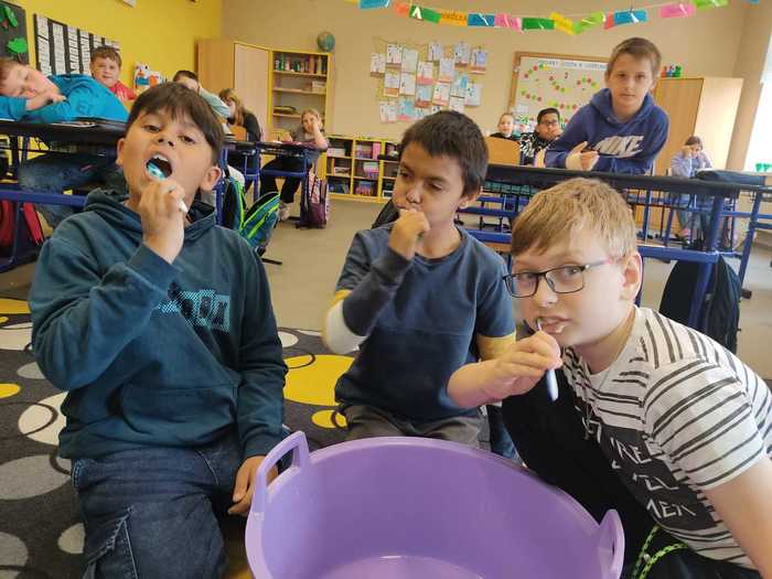 Ve čtvrtek 27. dubna proběhl ve 3. třídě projekt Zdravé zuby, krásný úsměv. S žáky jsme si povídali o tom, proč je tak důležité se o své zuby starat. Pak děti zhlédly video o správném postupu při čištění, a také si samy zoubky vyčistily přinesenými kartáčky. Závěr projektu patřil obrázkům zdravých a nemocných zoubků a vhodných pomůcek pro dokonalé vyčištění chrupu.