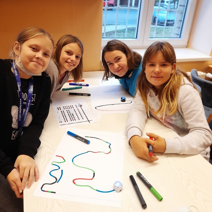 Na dnešním setkání Badatelského klubu jsme se věnovali programování robůtka Ozobota. Děti si pomocí barevných fixů a ozokódů navrhly na papír ozobotí dráhu. Ozobot pak podle kódů zrychloval, měnil směr, couval, otáčel se, měnil barvu led světla, nebo přeskakoval na jinou čáru.