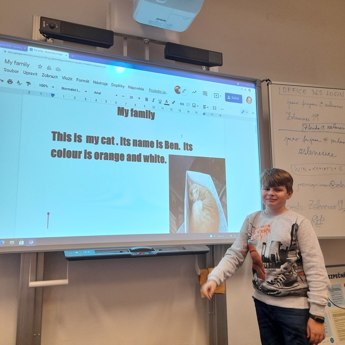 Děti z páté třídy pracovaly v průběhu listopadu na hodinách anglického jazyka na projektu My family. Projekt tvořily na počítači v naší multimediální učebně a jejich úkolem bylo přiblížit svou rodinu ostatním spolužákům. Ve dvojicích si pomáhaly s tvorbou doprovodného anglického textu i grafickým zpracováním fotek. Své hotové práce pak odprezentovaly před třídou.