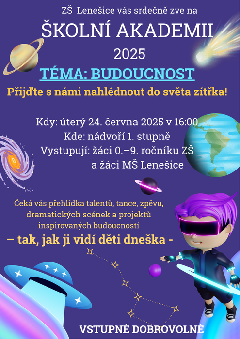 Zatímco se na teploměru každým dnem přibližujeme vysokým letním hodnotám a vůně prázdnin už se opírá o školní lavice, v ZŠ Lenešice vrcholí přípravy na velkou událost závěru školního roku – ŠKOLNÍ AKADEMII 2024/2025. A letos to nebude jen tak ledajaká akademie! Nese v sobě celoroční téma naší školy – BUDOUCNOST. A věřte, že o nápady na to, jak by mohla budoucnost vypadat, rozhodně nebude nouze. Každá třída se vydala svou vlastní cestou. Výsledkem je mozaika naprosto rozdílných, a přesto stejně originálních a dojemných vystoupení, která vám, doufáme, vykouzlí úsměv na tváři a možná i malou slzičku dojetí. V současných horkých dnech vrcholí generální zkoušky – třídy nacvičují, pilují každý krok a doufají, že vše dopadne podle jejich představ. Do toho všeho se samozřejmě míchá lehká nervozita, obrovské nadšení a spousta smíchu. Velkou radost máme i z toho, že naše pozvání přijala i MŠ Lenešice, která si rovněž připravila svůj vlastní kousek budoucnosti – a jak dobře víme, ti nejmenší umí často překvapit, a to nejen svou hravou roztomilostí.