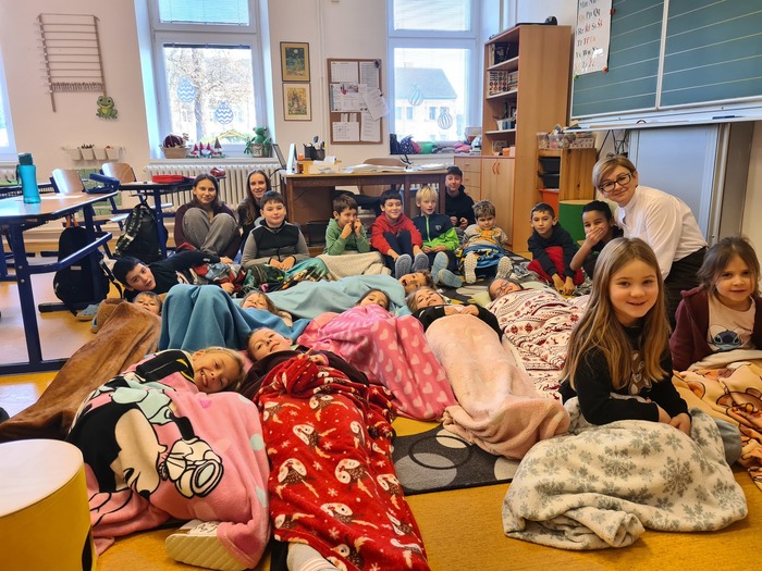 Dnes, 8. prosince 2025, jsme se v 1. a 2. třídě na chvíli zastavili v předvánočním čase a užili si společné adventní čtení. Na začátku jsme si s dětmi pověděli, co vlastně advent znamená – že je to období očekávání, klidu a příprav na Vánoce, a proč Vánoce slavíme. Poté se děti zachumlaly do dek, hlavy si pohodlně podložily polštářky a nechaly se unést pohádkou o čarodějce Peregríně. Naši deváťáci Dianka, Natka a Ondra se zapojili nejen do samotného čtení, ale také pomáhali mladším spolužákům, když si nebyli jistí, a kladli jim otázky, aby je vtáhli do děje. Společně jsme tak vytvořili prostředí, kde se děti cítily bezpečně a mohly se radovat z pohádky. Po čtení jsme si povídali o příběhu, děti kreslily Peregrínu foukající sníh z okna, pracovaly s listy a nakonec jsme si zazpívali koledy „Nesem vám noviny“ a „Pásli ovce Valaši“. V 1. třídě zazněla na závěr ještě veselá písnička „Rolničky, rolničky“Nejkrásnějším momentem však bylo, když děti samy vymýšlely, jaký dárek by Peregríně daly. Mezi odpověďmi zaznělo mnoho nápadů, ale nejdojemnější byla ta od jednoho prvňáčka, který řekl, že by jí dal pozvánku k nim domů na Vánoce, aby nebyla sama. Tento okamžik vystihl pravé kouzlo adventu – sdílení, laskavost a otevřené srdce.