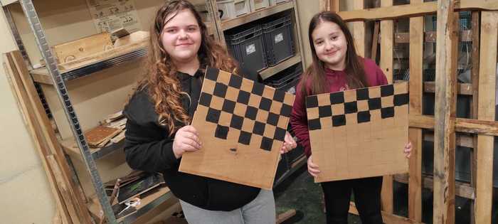 Žáci si sami rozměřili a nařezali desky, na které narýsovali a namalovali šachovnici. Po této práci se dále nařezaly figurky. K práci jsme využili materiál, určený k vyřazení. Desky ze starých skříní, figurky z příček z vyřazeného žebříku.