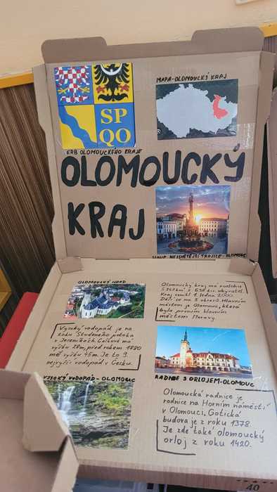 Celkem měsíc pracovali žáci osmé třídy na přípravě „Pizza boxu „kraje, který si vylosovali. Žáci se v tomto projektu neučili jen samotné zeměpisné poznatky o vylosovaném kraji ČR, mnohem podstatnější bylo, že dokázali vyhledat, zpracovat a na základě kritérií utřídit vyhledané informace. Navíc se učili kreativně pracovat s omezeným a nezvyklým pracovním prostorem, který museli promyšleně zaplnit.