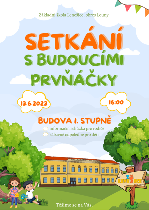 V úterý 13.6.2023 se od 16:00 uskuteční v budově 1.stupně setkání s budoucími prvňáčky.