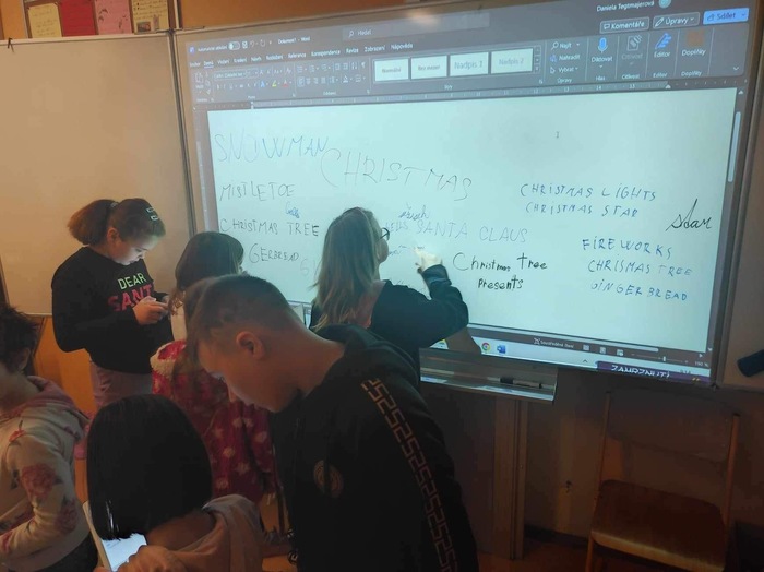 V první hodině, abychom se naladili na vánoční atmosféru, jsme si zazpívali společně pár anglických koled a tvořili myšlenkovou mapu k tématu Christmas (neznámá slovíčka si žáci překládali pomocí tabletu). Potom utvořili dvojice a přiřazovali k sobě obrázky a jejich anglický překlad. Na konci hodiny třeťáci překládali pokyny a podle nich zdobili třídní Christmas tree.