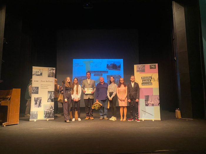 Tým osmáků (Marek Borč, Magdalena Mazáková, Stela Patrovská, Rozárka Vašková, Magdalena Zemanová) se zúčastnil se svou prací prezentování projektu Příběhy našich sousedů ve Vrchlického divadle v Lounech. Představili zde odborné porotě a divákům životní příběh pana Jaroslava Vávry z Lenešic, který v rámci projektu zdokumentovali.