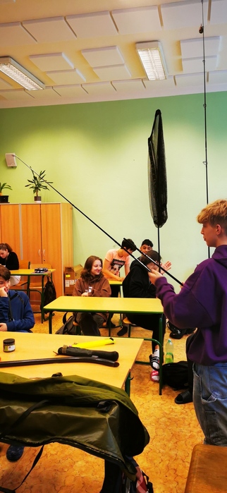 V přírodopisu v 7. třídě právě probíráme téma Ryby. Protože je v sedmičce několik rybářů, z nichž nejvášnivější je Martin Šmejkal, domluvili jsme se, že nám přinese ukázat rybářské vybavení a o tomto koníčku nám něco řekne. Martin to vzal s nadšením a přinesl nám do hodiny několik rybářských prutů, pořádný naviják, podběrák, hlásič na ryby a další a další věci. Vše nám ukázal a předvedl a s humorem jemu vlastním nám povykládal o svém velkém koníčku.