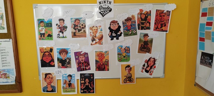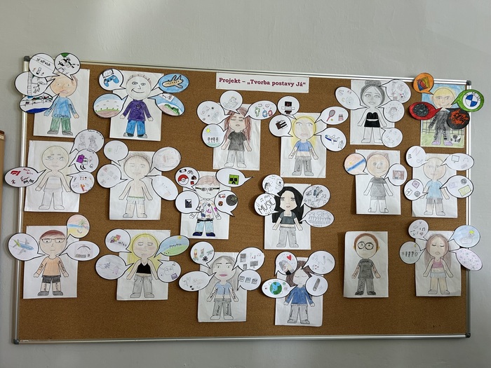 Každý si svoji postavu vybarvil podle sebe. Do bublin kolem postavy jsme kreslili obrázky svých koníčků a zájmů a dovnitř postavy jsme psali svoje vlastnosti. Některé postavy jsou fakt originální a jde podle nich poznat, kdo je kdo. Myslím, že se nám to celkem povedlo a byla to docela zábava.