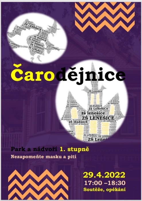 V pátek 29.4.2022 se budou v parku před 1.stupněm a na nádvoří 1.stupně od 17:00 do 18:30 konat tradiční ČARODĚJNICE. Všechny zveme na zajímavé soutěže a opékání vuřtů.