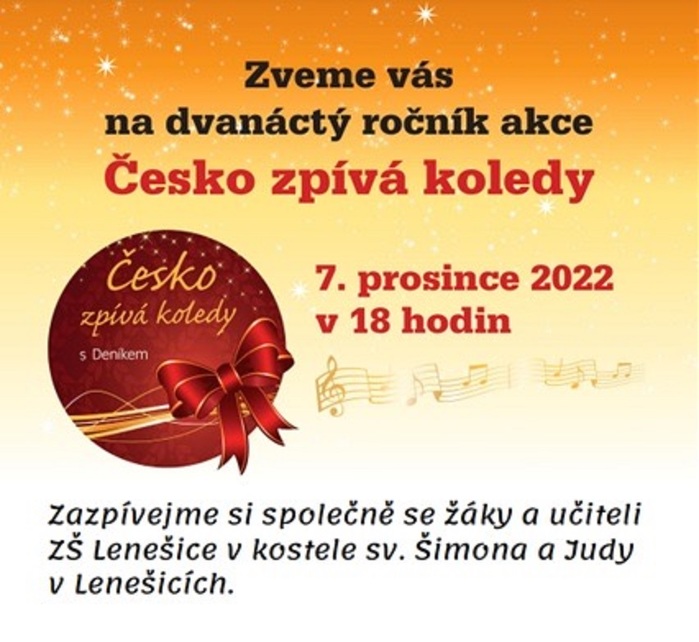 Ve středu 7.prosince 2022 Vás srdečně zveme do kostela sv. Šimona a Judy v Lenešicích na dvanáctý ročník akce ČESKO ZPÍVÁ KOLEDY. Přijďte si společně zazpívat se žáky a učiteli ze ZŠ Lenešice. Vezměte s sebou ZVONEČEK.