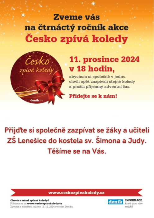 Zveme Vás na čtrnáctý ročník akce ČESKO ZPÍVÁ KOLEDY, která proběhne ve středu 11.prosince od 18:00 v kostele Sv. Šimona a Judy v Lenešicích.