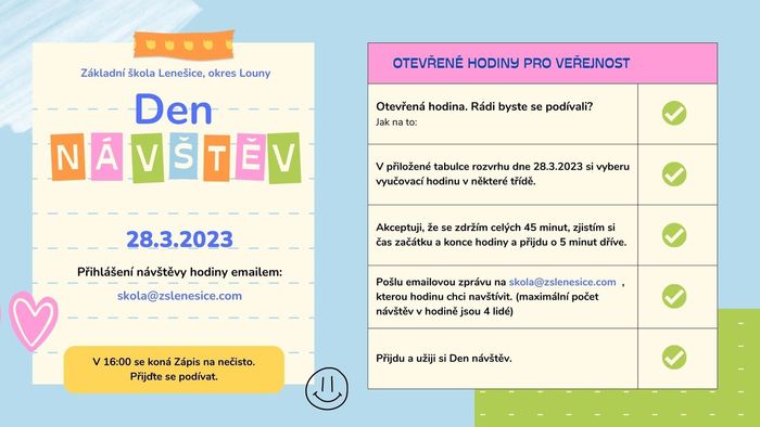 V úterý 28.3.2023 proběhne DEN NÁVŠTĚV. Rádi vás ve škole uvítáme v našich hodinách. Pokud si nějakou hodinu vyberete (rozvrh výuky k nahlédnutí níže), dejte nám prosím vědět na skola@zslenesice.com