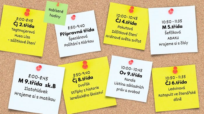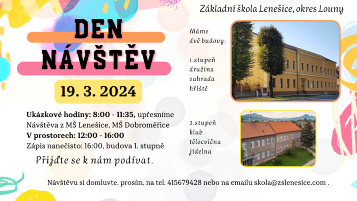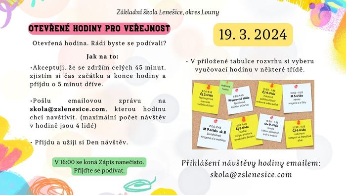 V úterý 19.3.2024 proběhne u nás ve škole DEN NÁVŠTĚV, kdy se zájemci z řad veřejnosti mohou přijít podívat na ukázkové hodiny od 8:00 do 11:35 a prohlédnout si školu od 12:00 do 16:00. Od 16:00 pak proběhne ZÁPIS NANEČISTO.