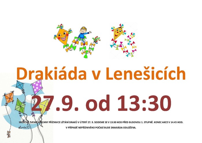 V úterý 27.9. se koná na fotbalovém hřišti drakiáda. Sraz před budovou 1.stupně ve 13.30 hod., konec v 14:45 hod. Družinové děti dovedeme zpět ke škole. Nezapomeň si vzít na toto odpoledne dobrého, již složeného draka. V případě nepříznivého počasí bude drakiáda přesunuta na jiný den.