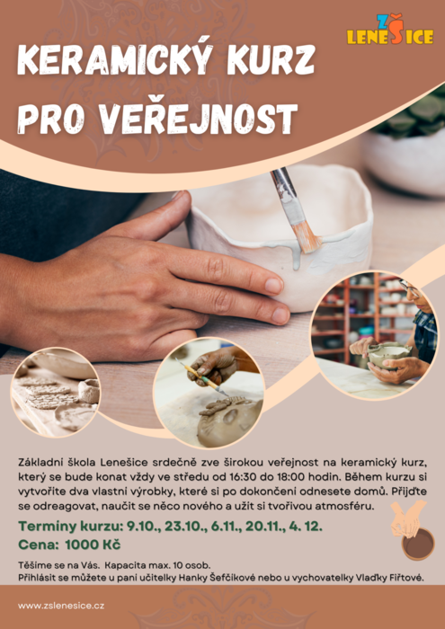 Základní škola Lenešice pořádá keramický kurz pro veřejnost. Vždy ve středu - 9.10., 23.10., 6.11., 20.11. a 4.11. od 16:30 do 18:00 v keramické dílně na 1.stupni. Cena za celý kurz je 1000 Kč. Přihlásit se můžete u paní učitelky Šefčíkové nebo ve školní družině u paní Fiřtové.