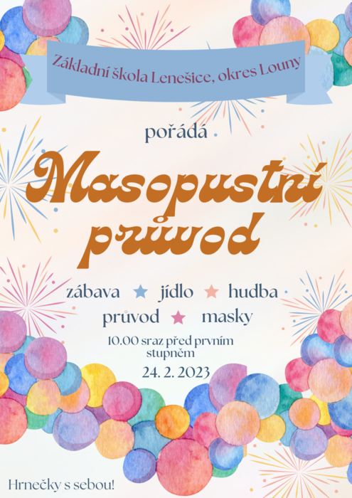 Zveme Vás srdečně na MASOPUSTNÍ PRŮVOD, začátek v pátek 24.2.2023 v 10:00 před 1.stupněm.