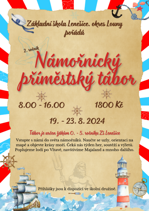 Základní škola Lenešice pořádá pro žáky 0. - 5.ročníku NÁMOŘNICKÝ PŘÍMĚSTSKÝ TÁBOR, který proběhne v termínu od 19.8. do 23.8.2024. Přihlášky jsou k vyzvednutí ve školní družině.