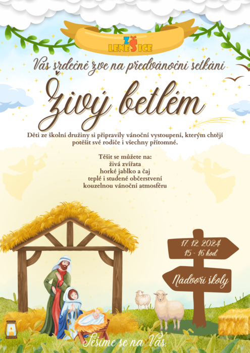 Srdečně Vás zveme na krátké předvánoční setkání s vystoupením dětí ze ŠD a malým občerstvením v úterý 17.12.2024 od 15:00 do 16:00 na nádvoří 1.stupně.
