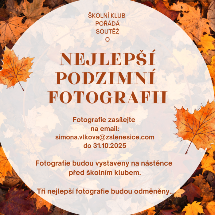 Školní klub pořádá soutěž o nejlepší školní fotografii. Tři nejlepší fotografie budou odměněny.