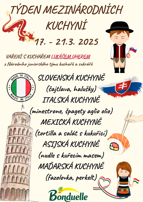 srdečně vás zveme na Týden mezinárodních kuchyní, který se bude konat ve školní jídelně ve dnech 17.–21. března 2025. Každý den se můžete těšit na speciality z jiného kouta světa!