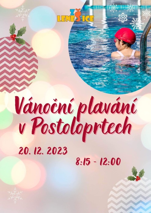 Ve středu 20. 12. 2023 proběhne pro žáky 1. stupně ,,Vánoční plavání" v plaveckém areálu v Postoloprtech. Pro omezený počet míst je nutné, aby se žáci 2.-5. ročníku včas nahlásili p. učitelkám. Cena programu včetně dopravy je 240 Kč.