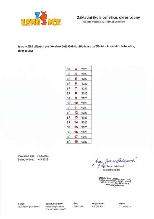 Úvod > Informace ze školy > Výsledky zápisu do první třídy pro školní rok 2023/2024